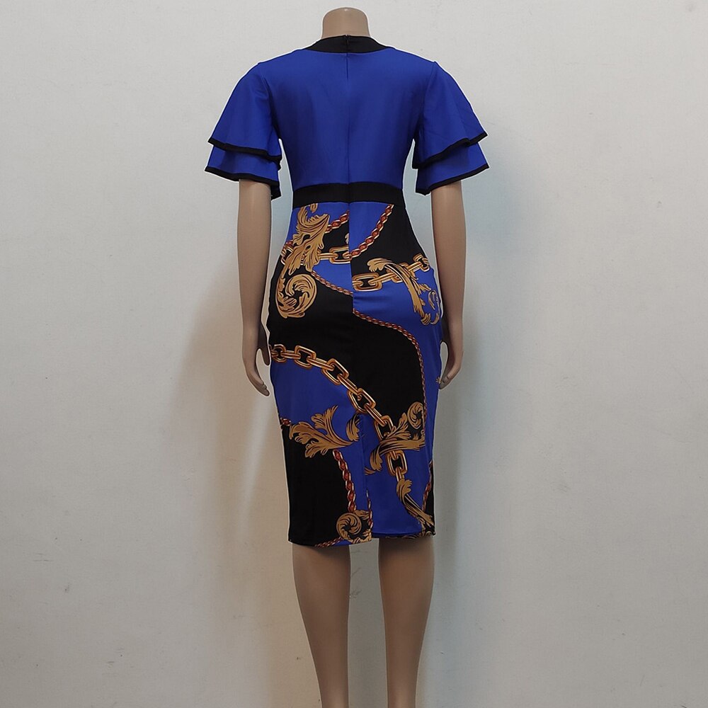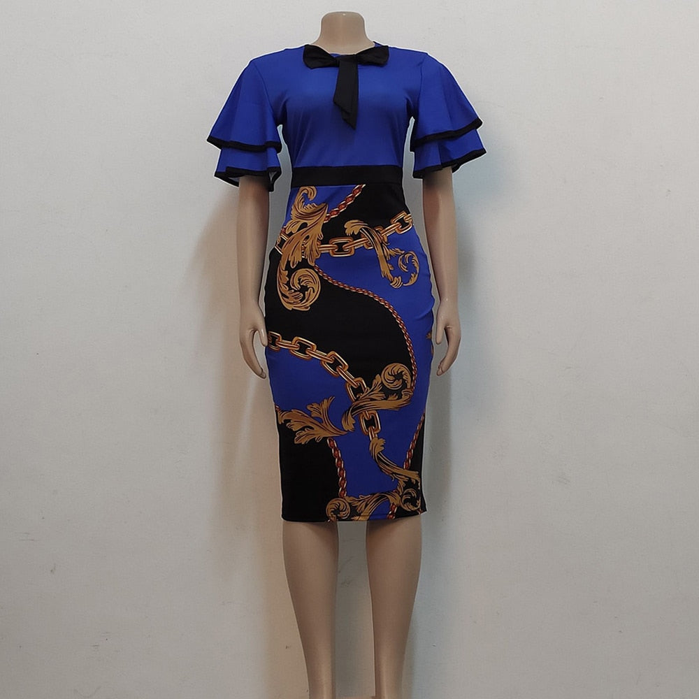2022 New Arrivals Women Elegant Vintage Dresses Chain Print Ruffles Sleeved Bow Neck Knee Length Midi Dress Ladies Dinner Dress